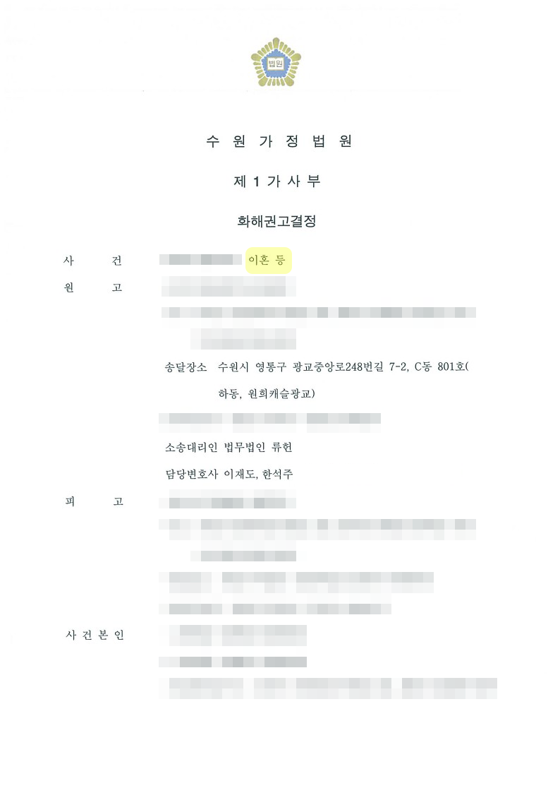 본 사안의 경우 혼인기간이 약 10년에 달하고 슬하에 미성년 자녀가 2인으로 소송에서 다투어야 할 쟁점사안이 많을 뿐 아니라 재산분할에 있어 다툼의 대상이 되는 재산 액수가 약 12억 원 이상에 달하였습니다. 통상 이와 같은 경우 이혼 등 소송 기간이 짧아도 1년, 길어지면 그 이상의 시간동안 이어지는데 본 법무법인의 신속하고 정확한 자료 분석 및 소송 진행에 따라 의뢰인께서는 약 2개월이라는 빠른 시간 내에 배우자와 합의할 수 있었고, 변호사는 합의서를 재판부에 제출하여 같은 내용으로 화해권고결정을 수령하여 원만히 사건을 종결지었습니다.
