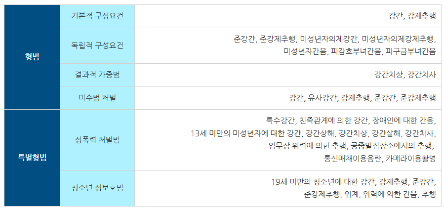 위 사진을 보면 알 수 있다시피, 성범죄는 기본적으로 형법과 특별형법으로 나누어 규정하고 있습니다. 형법에서는 강간과 강제추행을 중심으로 규정하고, 특병형법에서는 성폭력처벌법과 청소년 성보호법으로 나누어 규정하고 있죠.