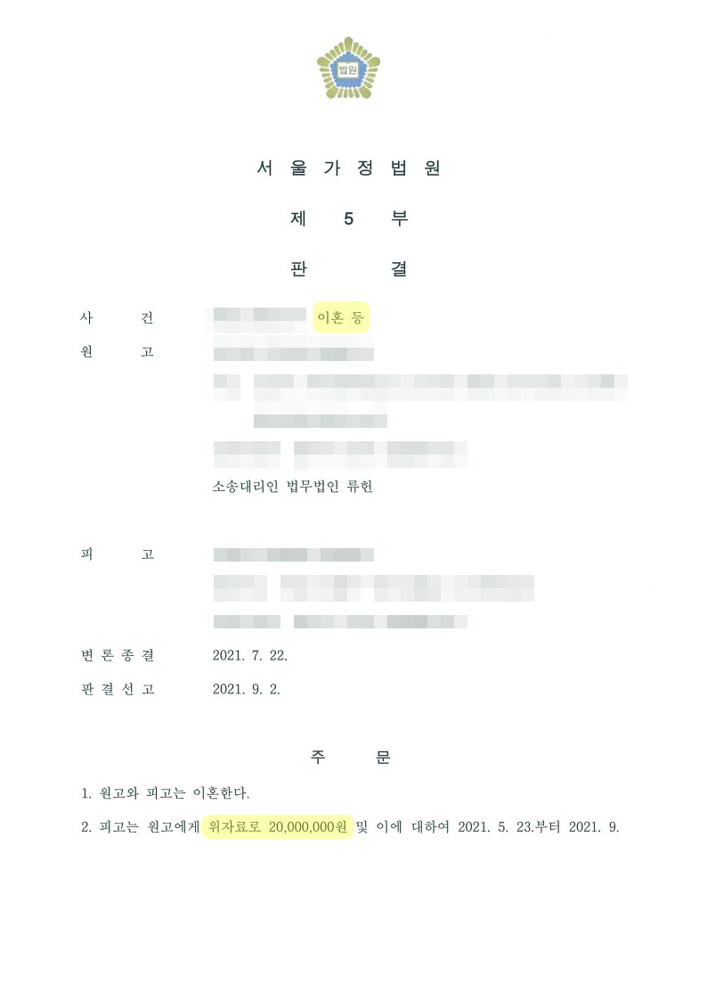 의뢰인께서는 이 사건 혼인관계가 파탄에 이른지 너무도 오랜 시간이 흘러 기억이 흐려진 부분들이 많고, 증거가 부족한 점, 상대방이 오랜 기간 연락두절 상태인 점을 우려하시었으나, 변호사는 의뢰인의 진술 및 증거자료를 바탕으로 상대 배우자의 혼인 파탄에의 귀책사유를 면밀히 분석하여 주장을 펼쳤고, 특히 입증자료가 부족한 부분은 의뢰인 가족들의 사실확인서 등을 통해 보강하여 재판부를 설득하였습니다.