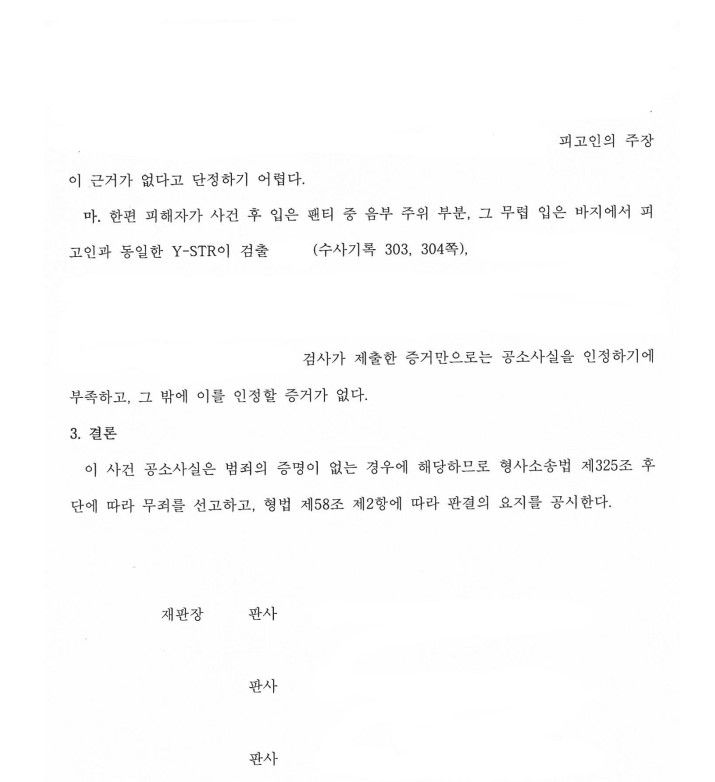 가장 어려웠던 점은, 피해자의 속옷에서 의뢰인의 정액으로 추정되는 DNA가 발견되었던 것인데, DNA관련 이론 등을 분석하여 DNA검사결과를 탄핵하고자 노력하였습니다(아래 판결문 이유와 같이 결국 탄핵에 성공하였습니다).