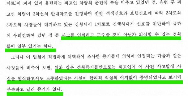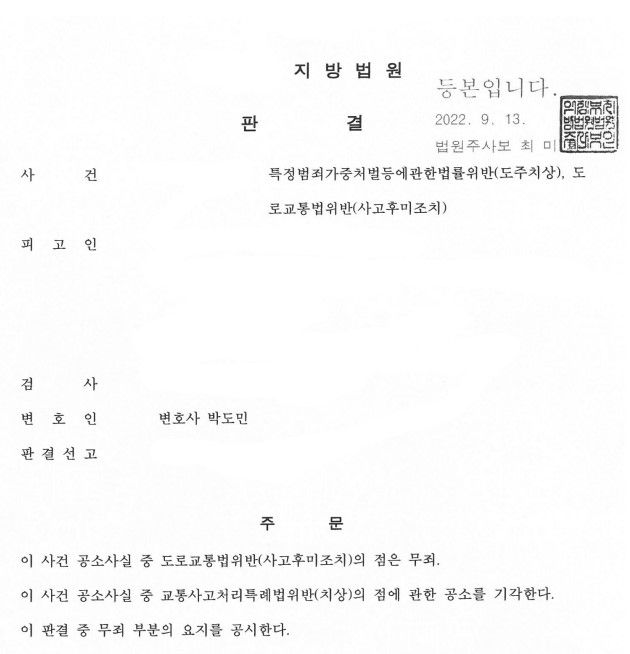 의뢰인의 도주치상, 사고후미조치 혐의 모두에 대하여 무죄 판결이 선고되었습니다.