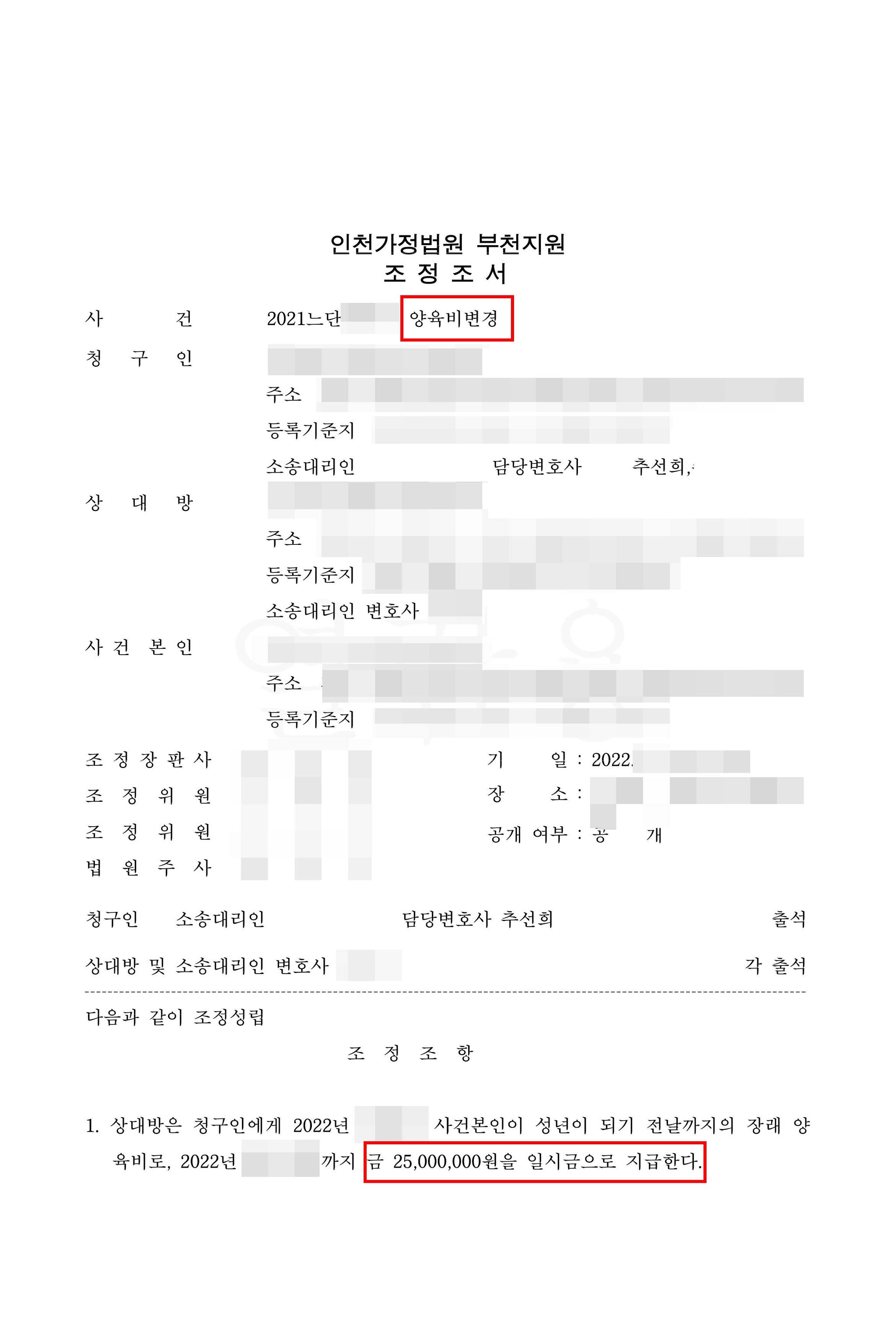 하지만 다행히 이번 사건의 의뢰인은 일시불로 양육비를 받아야 하는 이유를 정확히 소명해 소송이 아닌 조정으로 사건을 빠르게 마무리할 수 있었습니다.