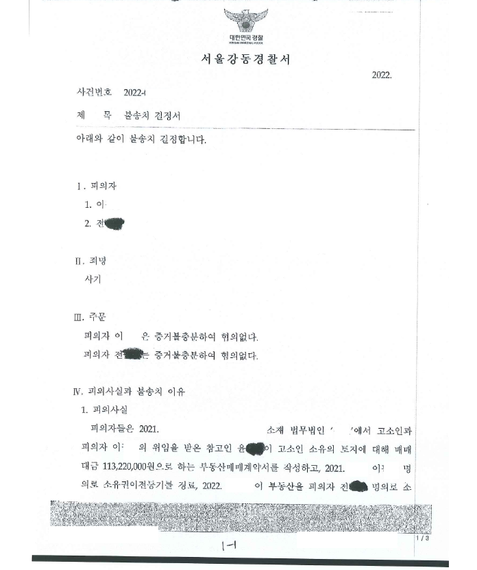 저는 경찰 조사부터 동석하여 조사를 받으면서 사건의 경위, 대물변제 경위, 처분 경위 등을 볼 때 명의신탁이 아니라 대물변제로 정당히 지급받은 점 등을 주장 입증하였고 경찰은 무혐의 불송치결정을 하였습니다.