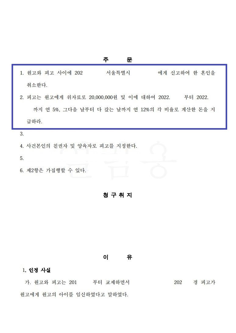 남성인 의뢰인은 피고와 교제 중 피고가 의뢰인의 아이를 임신하였다고 이야기하여 피고와 혼인신고를 하고 결혼생활을 시작하였습니다. 피고는 이후 아이를 출산하였는데, 의뢰인은 혼인 신고를 한 지 2년 후 아이가 자신의 친자가 아니라는 사실을 알게 되어 피고를 상대로 혼인취소 및 위자료 청구를 하게 되었습니다.