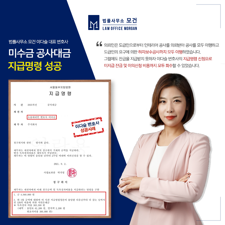 법률사무소 모건의 이다슬 대표 변호사는 공사대금을 비롯하여 대여금, 약정금, 물품대금 등 다양한 미수금 채권회수에서 풍부한 성공사례를 보유하고 있습니다. 지급명령, 청구소송 및 실질적인 집행까지 세심한 법률조력을 제공하고 있으니 도움이 필요하신 분들은 법률사무소 모건으로 문의하시기 바랍니다.