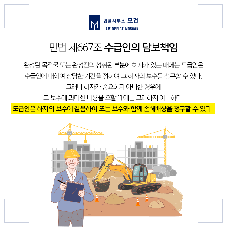 도급계약에서 목적물에 하자가 있을 경우, 도급인은 수급인에 대하여 하자보수를 청구할 수 있습니다. 도급인의 하자보수청구권과 수급인의 청구권과 동시이행관계에 있기 때문에 하자보수와 관련한 분쟁은 결국 공사대금 분쟁으로 이어질 수 있는 것입니다.
