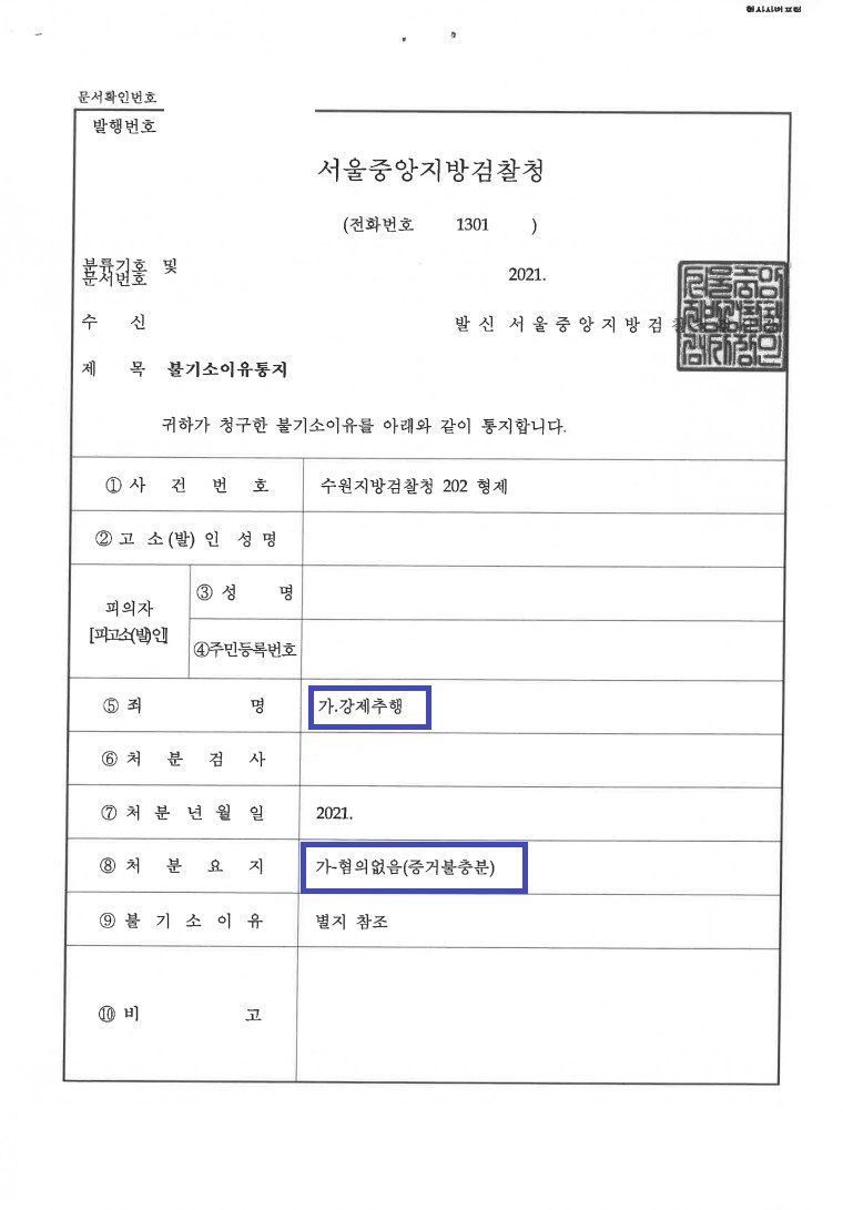 최민형 변호사는 술집 복도의 CCTV를 통해 확인되는 모습을 통하여 의뢰인과 해당 여성은 당시 타인 앞에서도 서로 호감을 표시하는 관계였다는 점, 동석한 지인의 확인서를 통해 의뢰인과 여성은 술자리에서 벌칙 외에도 스킨십을 다수 하였다는 점 등을 근거로 의뢰인에게는 강제추행의 고의가 없었다는 점을 적극 주장·입증하였습니다. 위와 같은 조력 하에, 의뢰인은 「혐의없음(증거불충분)」처분을 받았습니다.