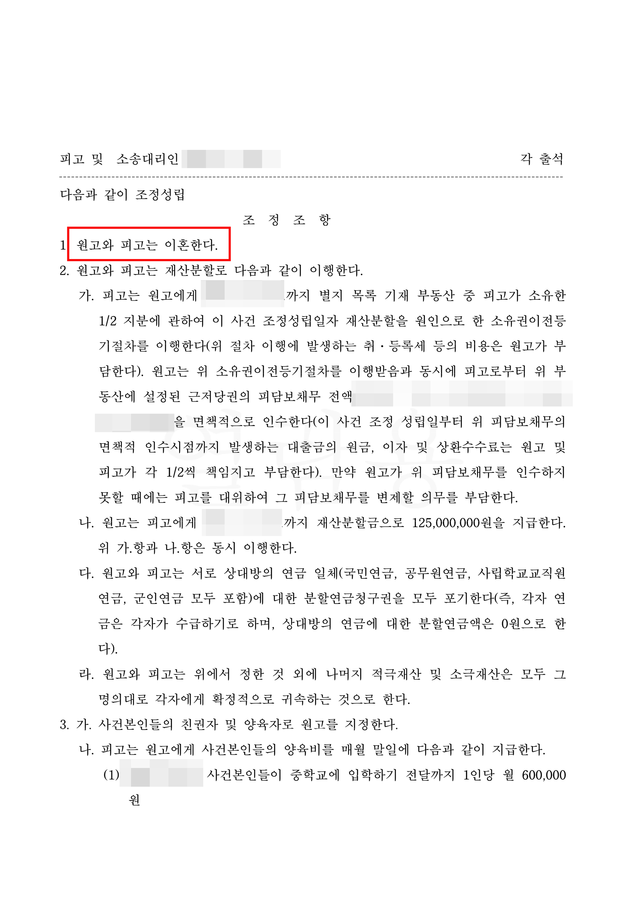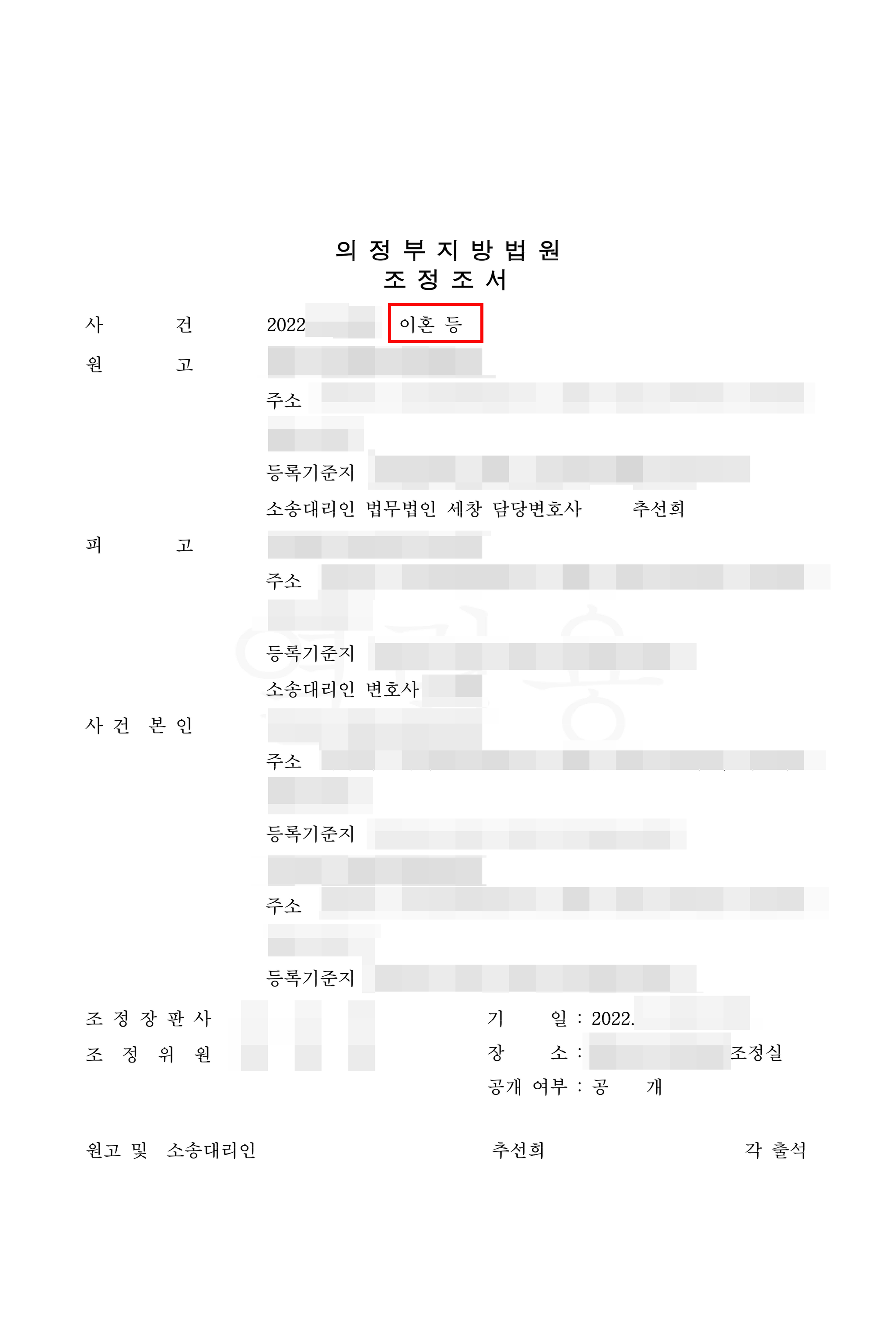 그래서 이혼소장을 먼저 접수하기보다는 상대방과 원활하게 합의를 통해 이혼절차를 마무리하기 위해 이혼조정을 신청하였던 것이었는데, 다행히 본변호사의 조력을 받아 상대방과 원만하게 합의를 할 수 있어, 이혼조정에서 빠르게 이혼절차를 마무리할 수 있었습니다.