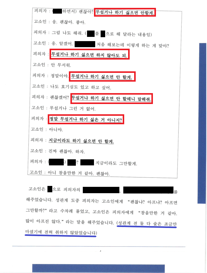 ② 성관계 중에도 A는 B에게 다섯 차례에 걸쳐 “무섭거나 하기 싫으면 안 할게. 지금이라도 말해줘”라는 물어서, B의 진지한 동의를 얻음