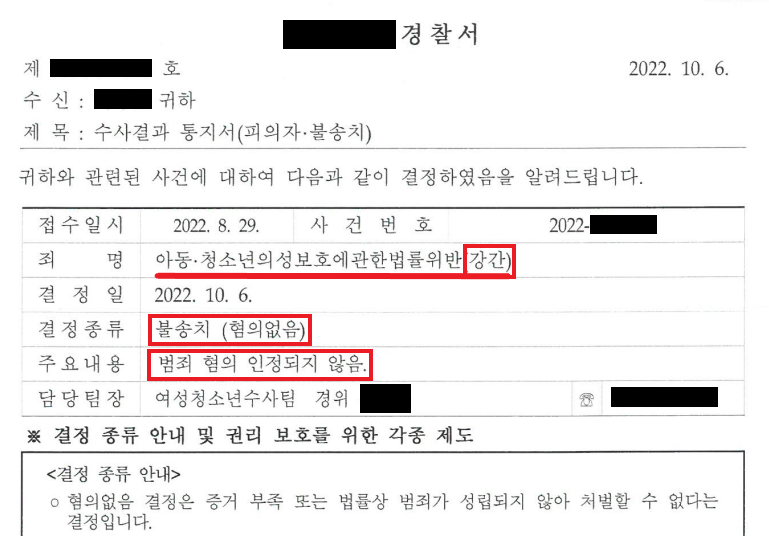 3. 법적 조력 결과 - 아동청소년강간 무혐의 + 경찰단계 불송치