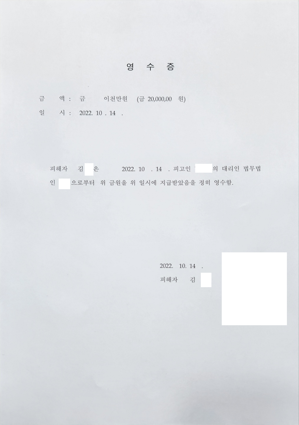 가해자는 변호사를 통하여 저희에게 연락하여 피해액을 배상할테니 형사 합의를 해 달라고 요청하여 저희는 피해액을 배상받고 형사 합의만을 해주었습니다(이 사건에서는 피해액을 분납으로 받기로 한 경우입니다).