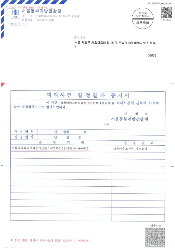 이에 서울동부지방검찰청은 의뢰인님에게 아무런 전과 기록이 생기지 않는 "기소유예"처분을 내렸습니다.