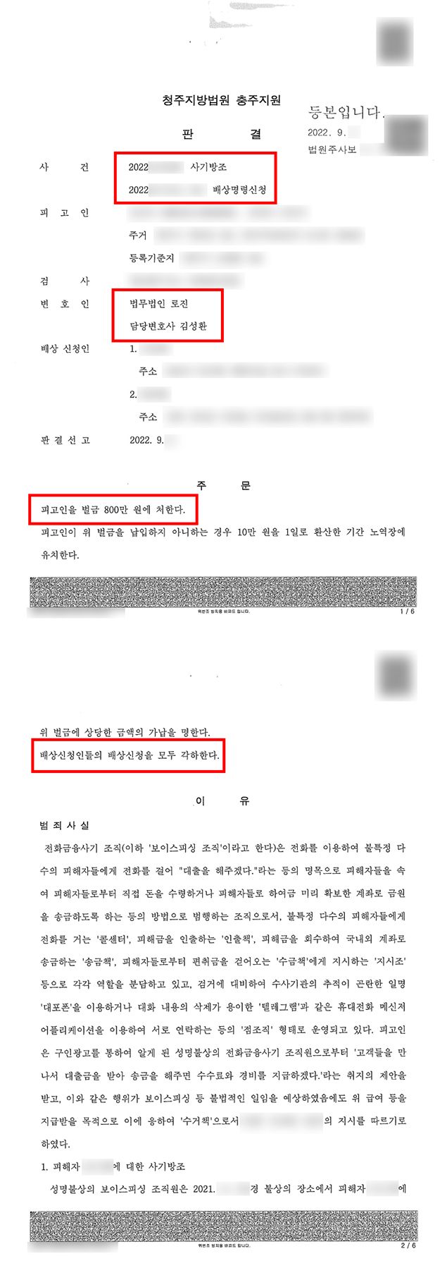 보이스피싱 범죄는 강력한 처벌을 받으며 단순 가담자 역시 합의를 하지 못한다면 실형의 위험성이 높습니다. 다행히 재판부는 법률사무소 로진 전담팀의 주장 내용을 상당 부분 받아들여 의뢰인에게 벌금 800만 원을 선고하였고, 이 판결에 대해 검찰은 당연히(?) 항소하였습니다.