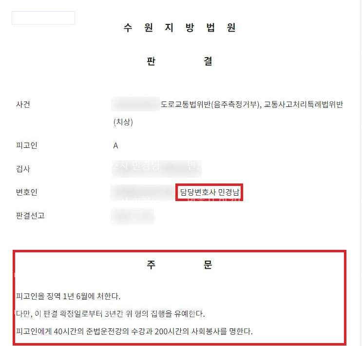 피고인에 대하여 집행유예, 준법운전강의 및 사회봉사 명령의 판결이 내려졌습니다.