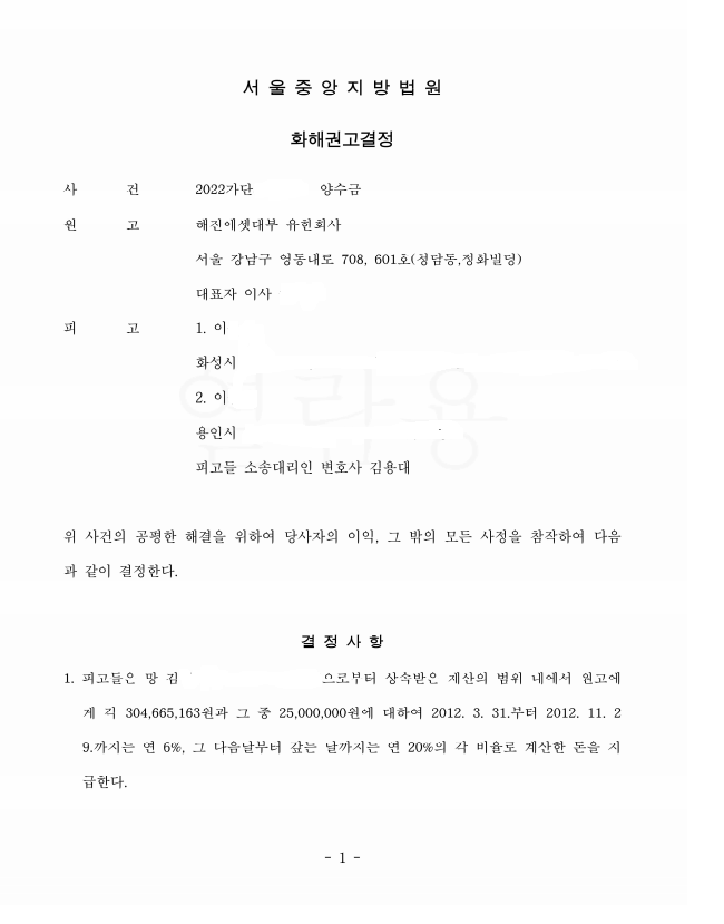 이에 본 법률사무소는 양수금 청구소송이 진행중인 법원에 위와 같은 특별한정승인 수리결정을 제출함으로써 결국 법원으로부터 피고들은 상속받은 재산의 범위내에서만 채무를 갚으라는 화해권고결정을 받을 수 있었습니다.