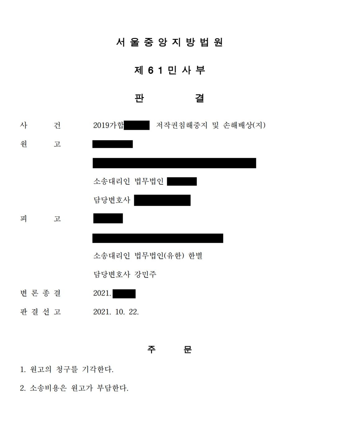이에 강민주 변호사는 원고 캐릭터의 변화 과정을 입증하기 위하여 저작권 위원회에 원고가 최초 등록할 당시 제출한 캐릭터 이미지를 사실조회함으로써 현재 모습과 상당히 다름을 주장하였고, 캐릭터에 대한 실질적 유사성 입증을 위해 감정신청을 하면서 한 시점의 캐릭터모습이 아닌 수년간 캐릭터의 다양한 모습과 굿즈에 드러난 모습등을 전부 감정토록 한 바, 양 캐릭터 사이에 실질적 유사성이 인정되지 않고 신생 디자이너의 캐릭터가 원고의 캐릭터 저작권을 침해하지 않았다는 전부 승소판결을 이끌어 냈습니다.