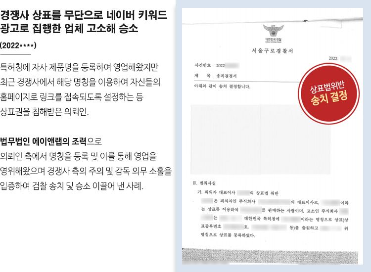 의뢰인은 이미 특허청에 2015년 자사 제품 명칭을 등록하였습니다. 하지만 최근 경쟁사에서 네이버 키워드 스폰서링크 계약을 체결하여 운영하였고, 더욱이 의뢰인의 등록한 명칭을 이용, 경쟁사의 홈페이지로 접속되게 하는 등 피의자의 광고에 의뢰인의 상표를 표시함으로써 상표권을 침해당했습니다.