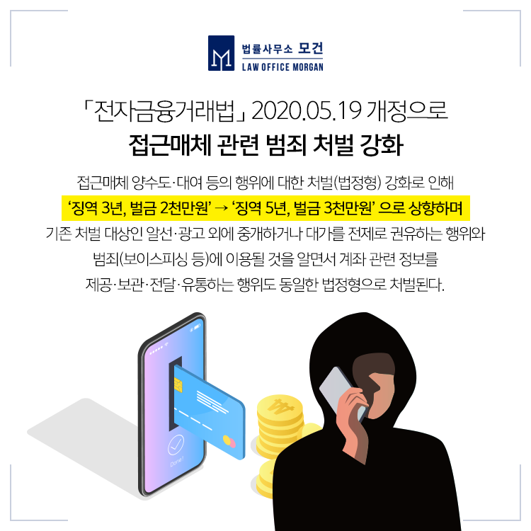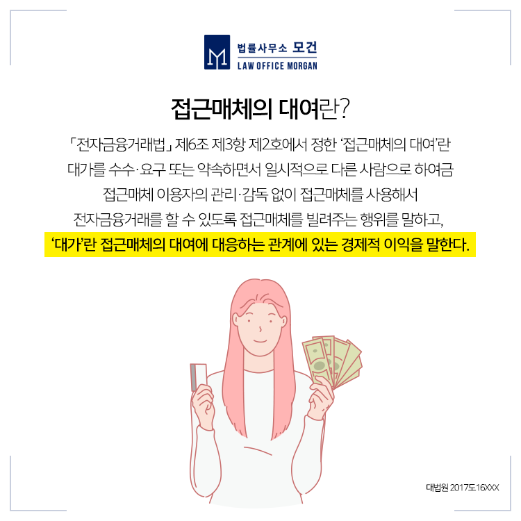 「전자금융거래법」에서는 '대가를 수수 · 요구 또는 약속하면서 접근매체를 대여하는 행위'를 금지하고, 이를 위반하여 접근매체를 대여한 사람을 처벌하고 있습니다. 접근매체 대여행위는 보이스피싱 등 다른 범행에 이용될 가능성이 크므로 그 죄질이 가볍지 않고, 실제로 대여한 접근매체가 보이스피싱 범행에 이용되면서 대여사실이 드러나 기소되는 경우가 많습니다.