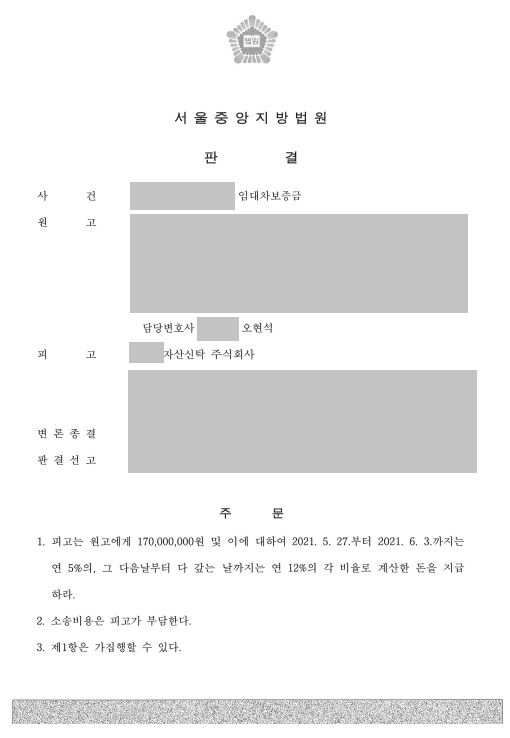 재판부는 신탁회사(C)가 임대인(B)의 임대인지위를 승계하였다는 임차인(A)의 주장을 인용하여, 원고 전부승소판결을 하였으며, 이후 본 변호사는 신탁회사C에게 판결금(보증금과 그 지연이자, 소송비용) 전부에 대하여 C에 판결금청구서를 보내어 보두 받아낼 수 있었습니다.