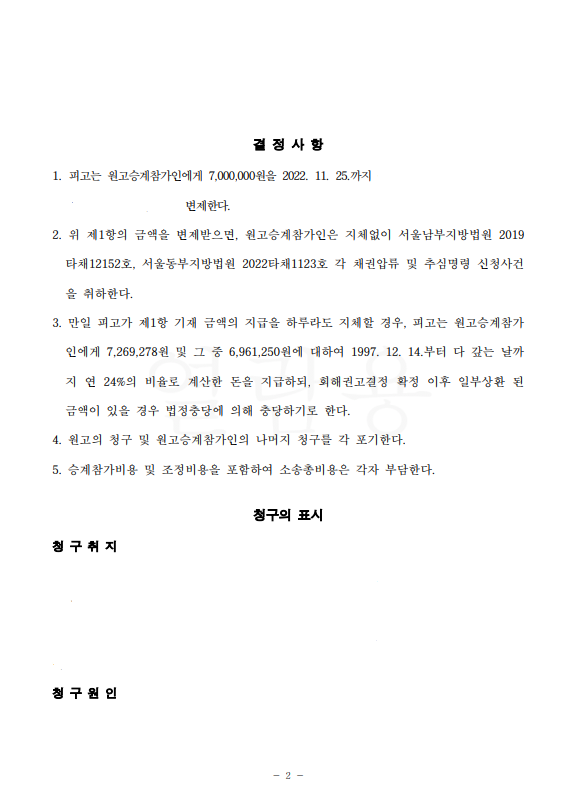 결국 1998년도의 적법한 선행판결로 인하여 위 두건의 추완항소는 판결로 진행이 될 경우 A씨의 패소가 명백한 상황이었고 이에 신후 법률사무소에서 항소심 법원에 조정기일 지정 신청 및 변론기일에서 수차례 합의시도 등을 통하여 결국 A씨가 제일호더블류홀딩스자산대부 주식회사에게 원금 700만원만을 지급하는 것으로 조정이 성립되었습니다.