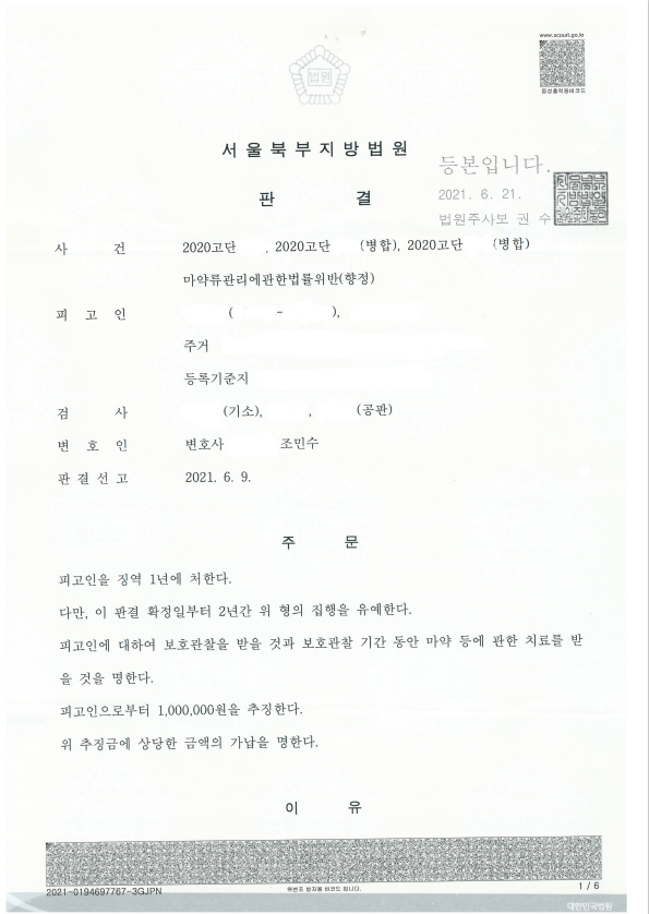 재판부는 "피고인이 동종 범죄로 교육이수조건부 기소유예 처분을 받은 전력이 있음에도 또 다시 이 사건 각 범행을 한 점, 수사기관으로부터 조사를 받은 이후에도 범행을 계속한 점, 피고인이 매수하거나 투약한 횟수가 적지 않은 점 등의 불리한 정상, 피고인이 다른 사람에게 필로폰을 전파한 것으로는 보이지 않는 점, 일부 범죄에 대하여는 피고인이 자수를 한 점, 피고인이 단약 및 치료 의지를 보이고 있고, 피고인의 가족들이 피고인과 유대관계를 유지할 것을 다짐하면서 선처를 탄원하는 점 등의 유리한 정상" 이라고 판시하면서 의뢰인에게 집행유예를 선고하였습니다.
