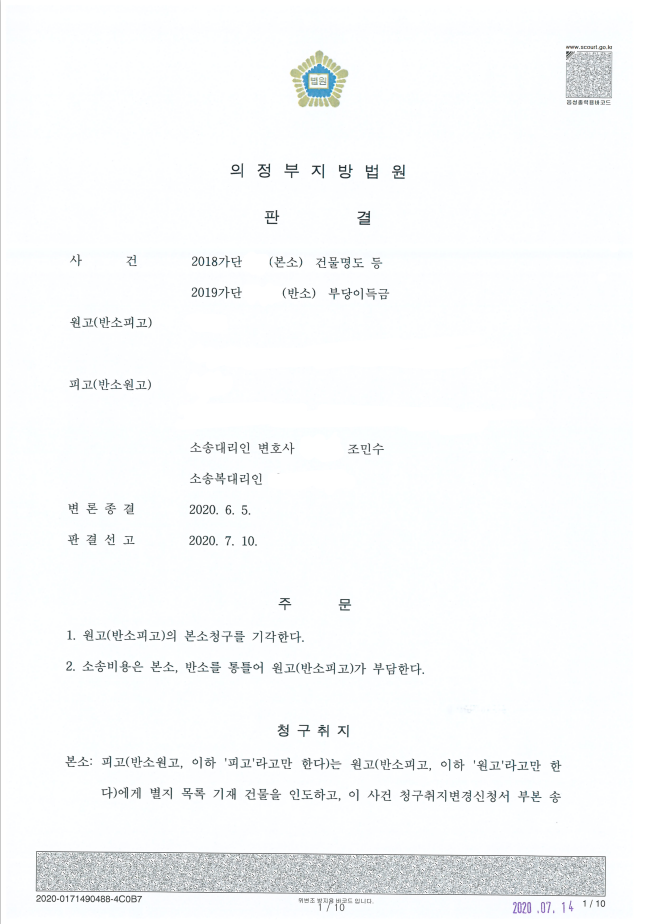 그 결과 재판부는 본 변호사의 주장을 전부 인용하였고, 의뢰인은 위 건물 명도 등 청구에서 전부 승소하게 되었습니다.