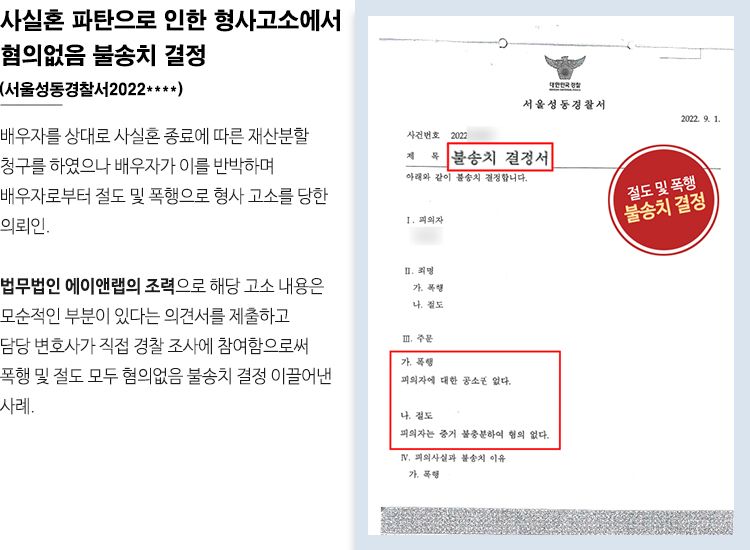 이에 따라 의뢰인은 경찰에서 불송치 결정을 받았고, 형사사건으로 인한 부담에서 벗어나 사실혼 재산분할 사건에 집중할 수 있게 되었습니다.