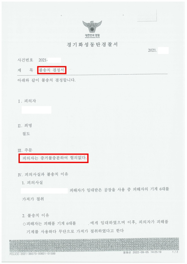 피의자는 기계의 소유자가 자신인 것처럼 행동한 ㅇㅇㅇ에게 기계를 매입하고 가져간 것으로 확인되며 피의자 절도 혐의는 증거불충분하여 혐의없다(위 사건 불송치이유서 발췌)