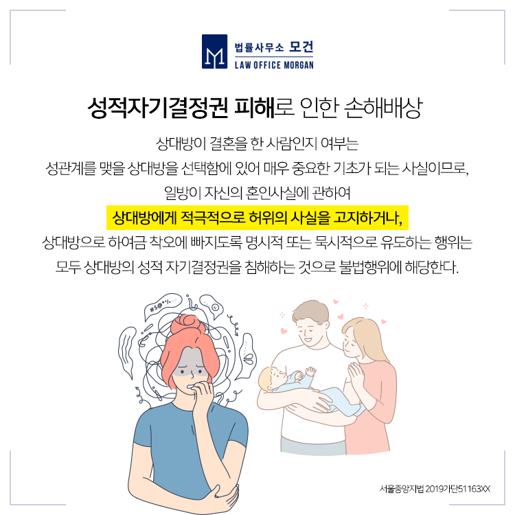 간혹 본인이 유부남인데도 그러한 사실을 숨긴 채 교제하는 남성들이 있습니다. 이 경우에는 접근을 달리하여야 하는데요. 가급적이면 원고가 상간녀소송을 제기하기 전에, 자신이 교제한 남성을 상대로 '성적자기결정권침해 손해배상청구소송'을 제기하는 것이 유리합니다.