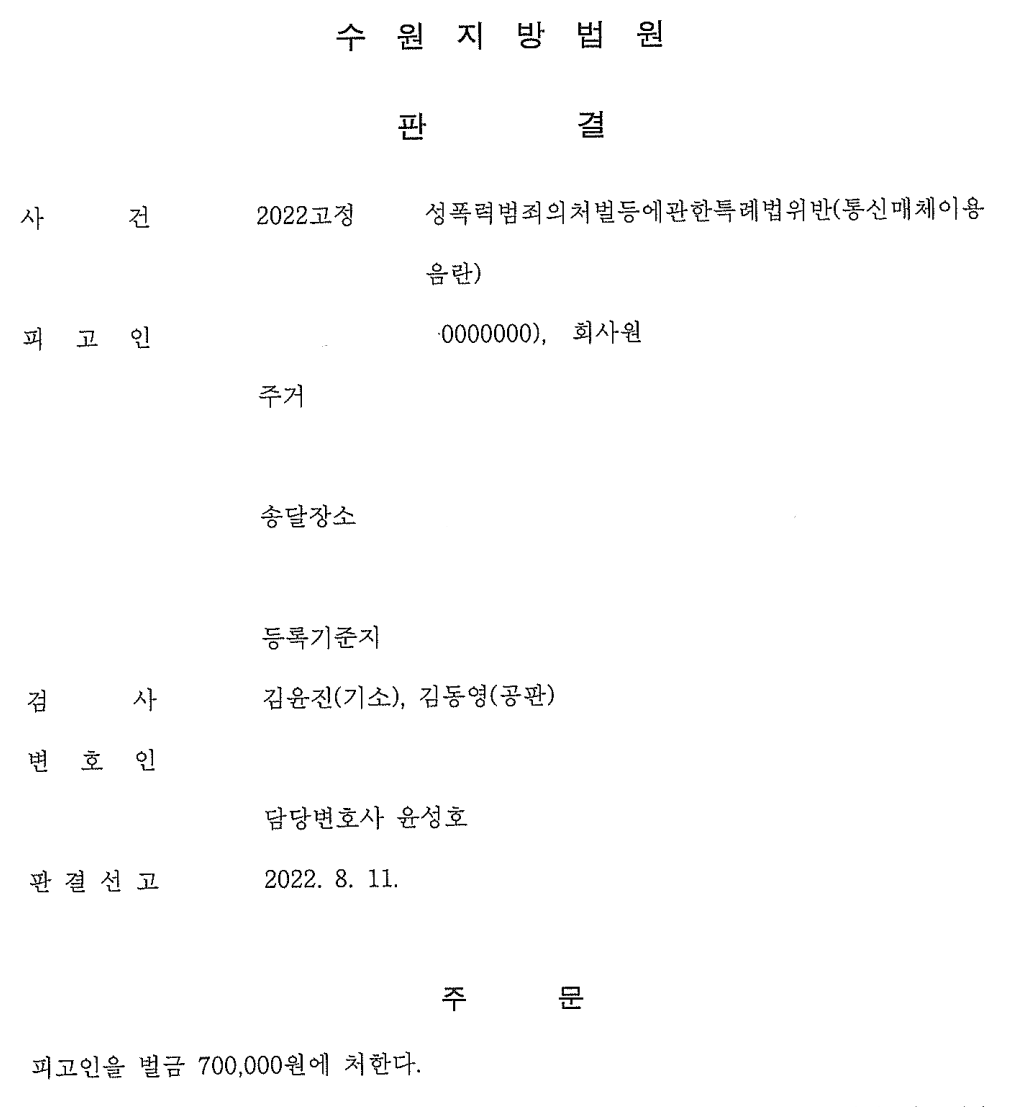 위와 같은 윤성호 변호사의 적극적인 의견제시 및 양형자료 제출에 의거 법원에서는 당초 검사가 벌금 200만 원으로 기소하였지만 벌금 70만 원만을 선고하였습니다. 벌금 액수가 거의 최저치로 많이 줄었지만 의뢰인께서 간절하게