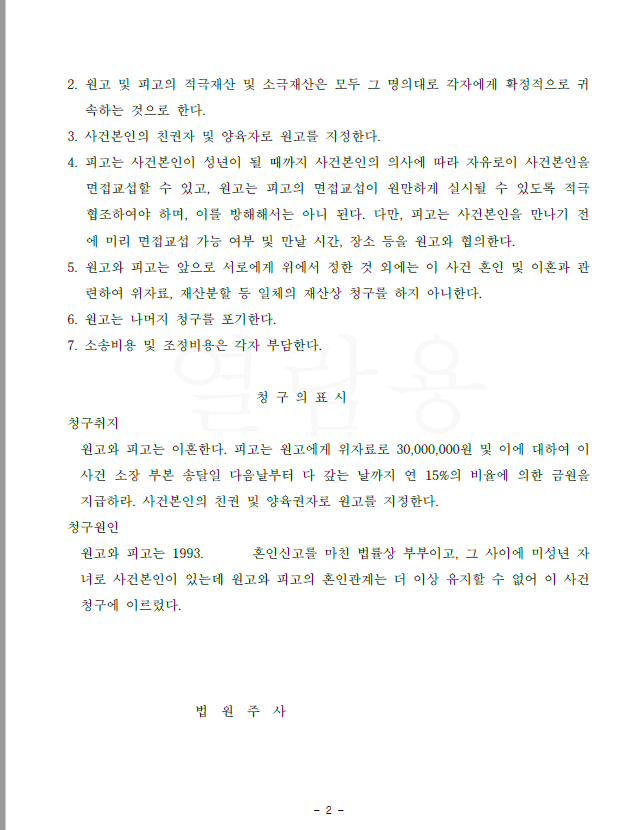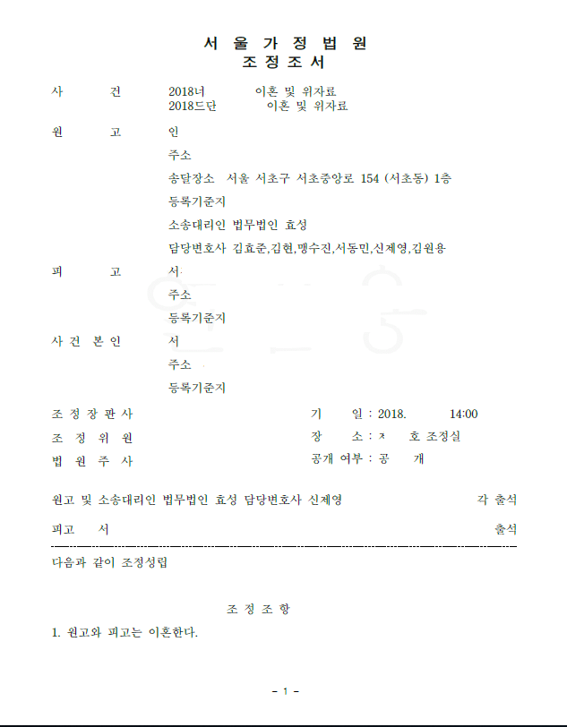 의뢰인은 이혼을 원하면서도 자신이 가진 재산이 상대방보다 훨씬 많아 재판상 이혼시 각자 명의의 재산(적극재산 및 소극재산)의 각자가 가지고 서로에게 재산분할청구를 하지 않기를 원하였습니다.