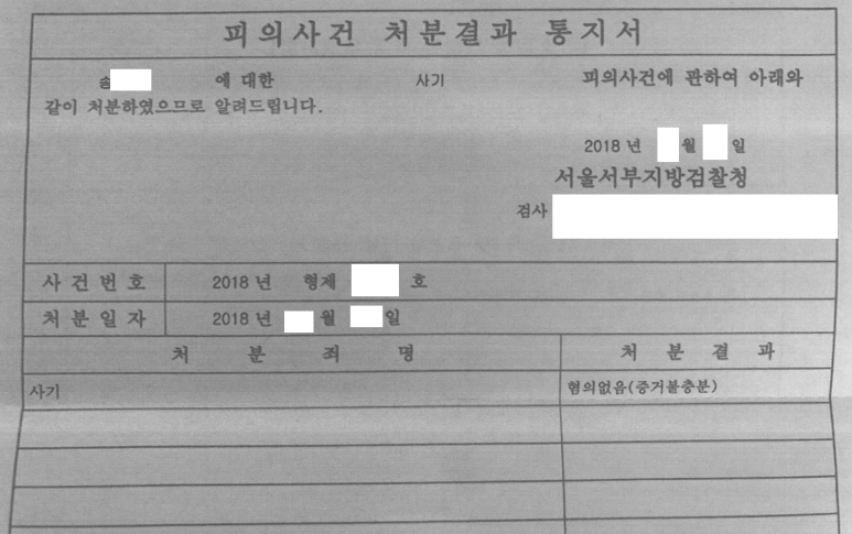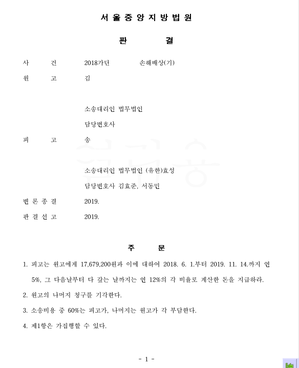형사고소 관련 검사는 증거불충분 무혐의 처분을 하였으며, 민사소송 관련 법원은 원고의 청구액을 1/2 감액한 판결을 선고하였습니다.