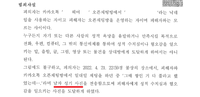 A씨는 2022. 4. 21. 22:59경 여성 헤어디자이너 B씨가 운영하는 카카오톡 오픈 채팅방에 들어가 마치 미용실 손님인척 속이고 대화를 하다가 갑자기 성기 사진을 전송하였습니다.