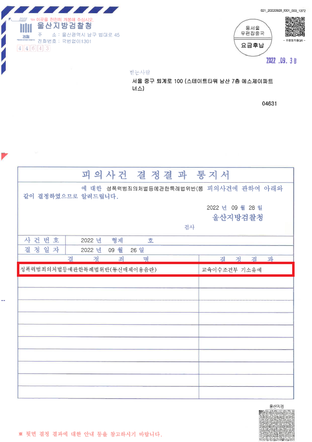 이러한 저의 조력을 바탕으로 A씨는 마치 손님인척 속이고 대화를 하다가 갑자기 성기 사진을 전송하였음에도 불구하고 최대한 유리한 금액으로 합의하고 '기소유예' 처분으로 받음으로써 법적 불이익을 최소화하면서 성범죄 전과자가 될 위기에서 벗어날 수 있었습니다.