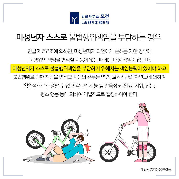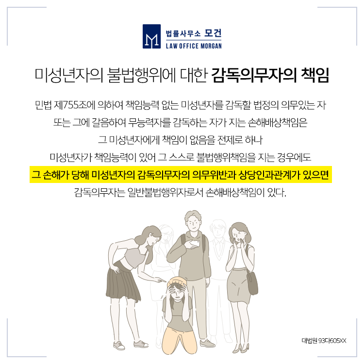또한 미성년자가 책임능력이 있어 그 스스로 불법행위책임을 지는 경우에도, 그 손해가 미성년자의 감독의무자의 의무위반과 상당인과관계가 있다면 감독의무자는 일반불법행위자로서 손해배상책임이 있습니다. 이는 미성년자가 실수나 장난으로 타인을 다치게 한 경우는 물론, 고의의 폭행, 상해, 강제추행 등의 범죄를 저지른 때에도 적용될 수 있습니다.