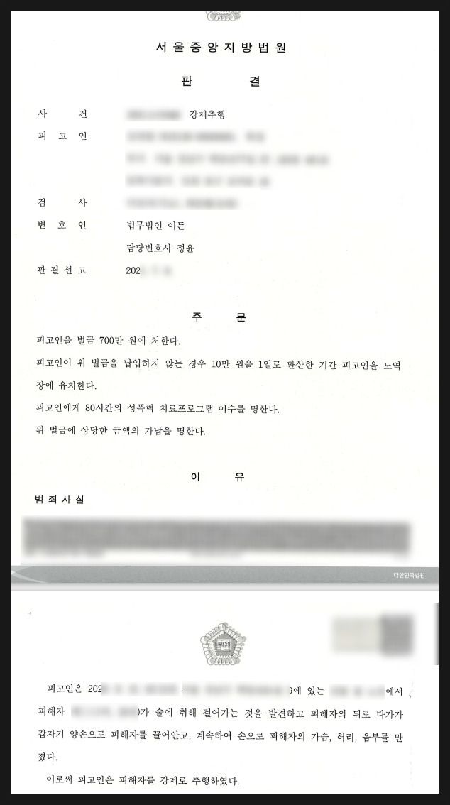 따라서 초반부터 확실하게 대응하는 것이 필요한데요. 그래서 오늘은 제가 직접 수행했던 사례를 토대로 '중한 처벌을 피하고 강제추행벌금형을 받을 수 있는 방법'에 대해 설명드리려고 합니다.