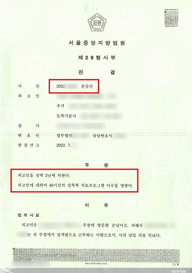 재판부는 법률사무소 로진의 주장을 모두 받아들여 피고인에게 징역 2년에 성폭력치료프로그램 40시간 이수 명령을 선고하였습니다.