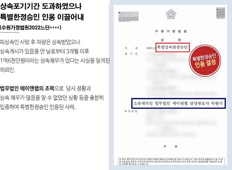 그 결과 수원가정법원은 박현식 변호사의 특별상속한정승인을 인용하였고 이로써 의뢰인은 1억6천만원이라는 큰 빚을 떠안을 위기에서 벗어날 수 있었습니다.