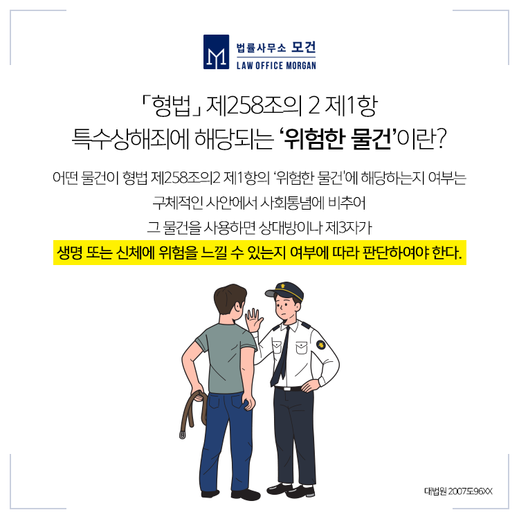 특수폭행이나 특수협박의 혐의는 '위험한 물건'을 휴대하여 폭행, 협박을 저지른 경우인데요. 이때 '위험한 물건'이란 꼭 칼이나 가위 등 흉기에 해당하지 않더라도 사람의 생명·신체에 해를 가하는데 사용할 수 있는 일체의 물건을 말하는데요. 판례에서는 휴대폰, 자동차, 병, 유리잔, 우산 등도 피해자를 위협하고 폭행을 하는데 사용하였다면 특수폭행이나 특수협박에 해당된다고 보고 있습니다.