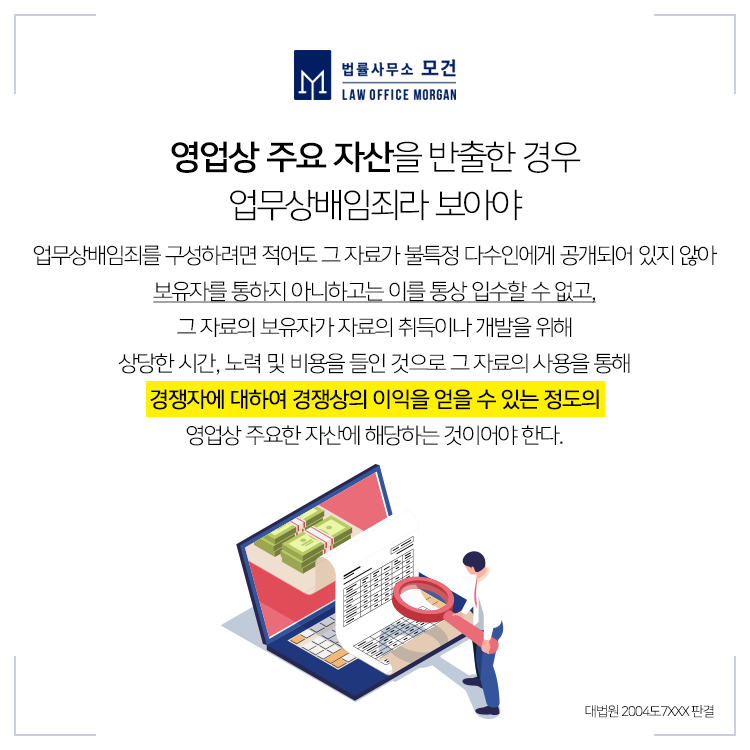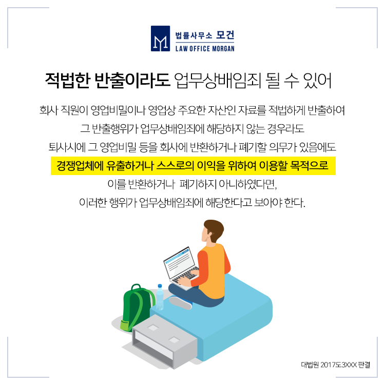회사에서 사용하거나 본인이 참여했던 자료 등을 퇴사 후 USB나 외장하드, 공유드라이브 등을 통해 반출하시는 분들이 계십니다. 하지만 해당 자료가 회사에서 영업상 중요한 자산에 해당된다면 업무상배임죄로 형사처벌 대상이 될 수 있음을 유의하셔야 합니다.