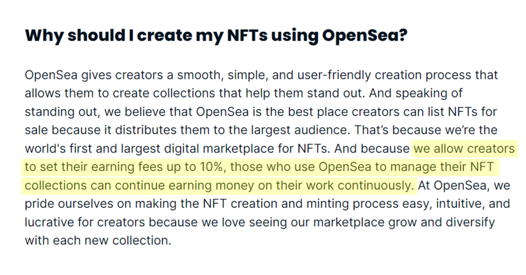 NFT 거래소마다 로열티 설정 여부나 비율은 다를 수 있지만, 가장 유명한 NFT 거래소인 OpenSea는 NFT를 민팅할 때 창작자의 수익금을 최대 10%까지 설정할 수 있어서 저작권자의 지속적인 수익을 보장할 수 있도록 해 두었습니다.
