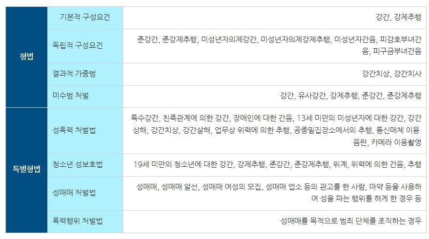 우리 형법은 강간과 강제추행을 기본으로 준강간, 미성년자의제강간 등의 독립적인 범죄를 별도로 구성하고, 결과적으로 중한 결과가 발생하는 치상, 치사의 경우를 규정하여 두었습니다. 그러다 사회가 발전하면서 여러 성범죄의 유형들이 나타나게 되고 이를 특별형법에 의하여 규정하고 있죠.