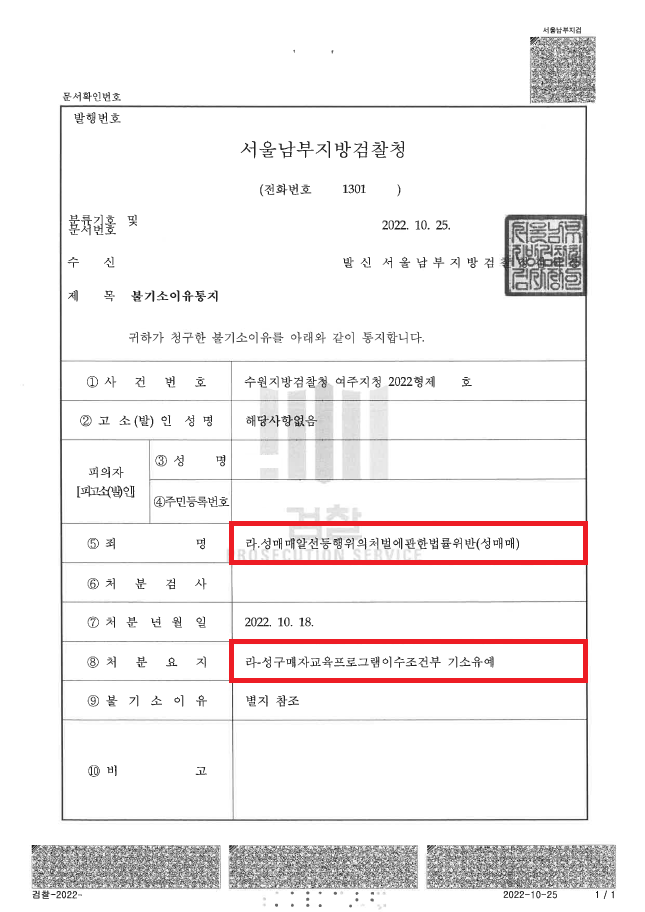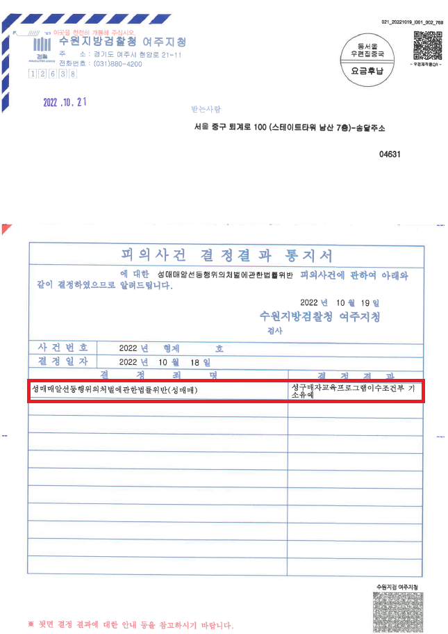 한참의 시간이 흐른 뒤, 경찰은 아청법위반(성매수등) 혐의가 아닌 성매매처벌법(성매매) 혐의로만 송치하였고, 이에 저는,