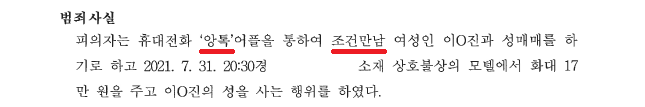 A씨는 랜덤 채팅 어플리케이션 '앙톡'으로 성매매 여성을 찾다가 여성 B씨와 조건 만남을 하기로 하고 2021. 7. 31. 20:30경 모텔에서 만나 화대 17만 원을 지급하고 성매매를 하였습니다.