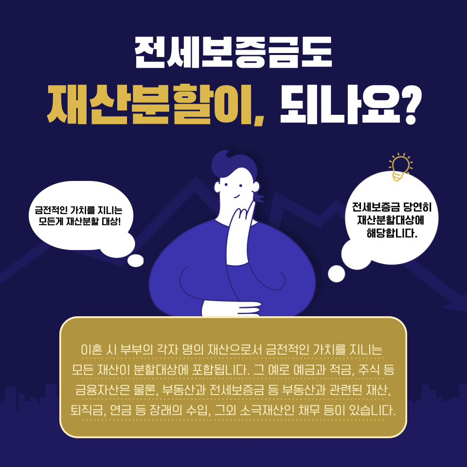 원칙적으로 이혼 시 부부의 각자 명의 재산으로서 금전적인 가치를 지니는 모든 재산이 분할대상에 포함되는데요. 그 예로 예금과 적금, 주식 등 금융자산은 물론, 부동산과 전세보증금 등 부동산과 관련된 재산, 퇴직금, 연금 등 장래의 수입, 그 외 소극 재산인 채무 등이 있습니다. 즉, 전세보증금도 당연히 재산분할대상에 해당합니다.