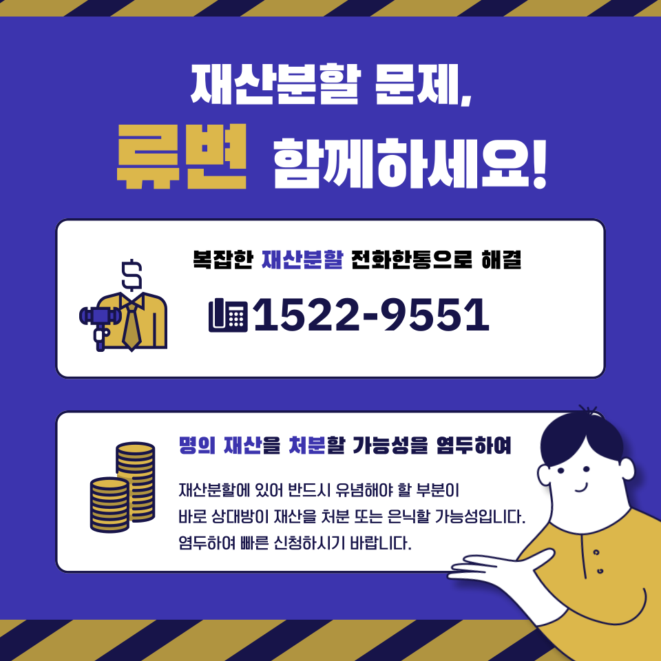 재산분할은 복잡한 문제임에 틀림없습니다. 이혼 후 삶의 질이 달리기도 한 문제이기에 한 치의 양보도 없이 팽팽한 신경전이 펼쳐질 것입니다. 상대방의 어떠한 움직임에도 완벽히 대응하여 내 몫을 안전하게 분할받고 싶다면 수많은 재산분할 관련 사례를 보유한 이혼전담센터 률을 찾아주세요. 의뢰인의 이야기를 경청하고 마음을 다해 돕겠습니다.