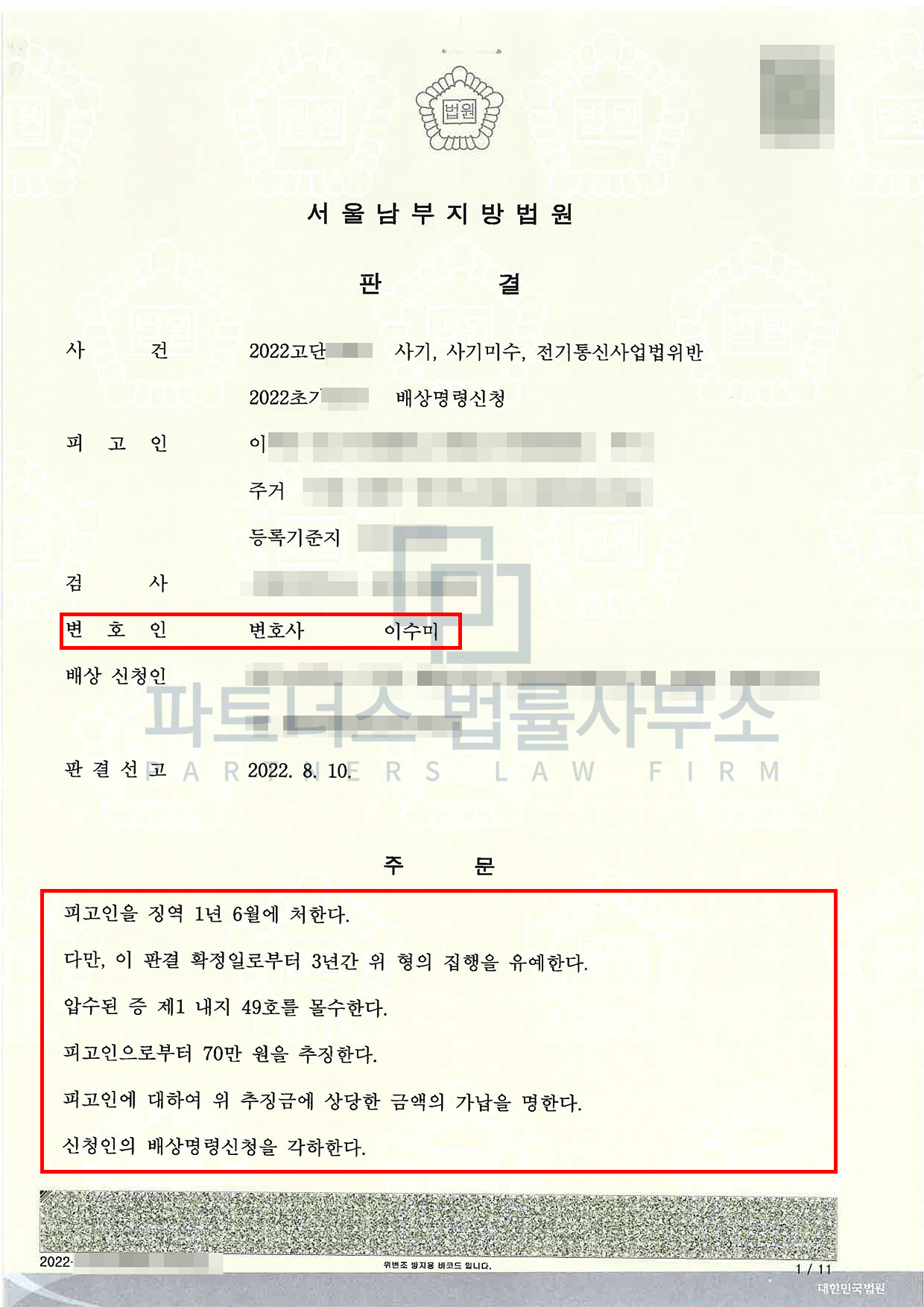 그러나 저희 파트너스법률사무소는 ① 의뢰인은 전과가 전혀 없는 초범인 점, ② 이 사건 범행으로 인한 피해액은 1,800만 원인데 공소제기 이후에 피고인이 피해 변상을 하고 피해자와 원만하게 합의한 점, ③ 피고인은 확정적 고의가 아니라 미필적 고의를 가지고 이 사건 범행에 가담한 것으로 보이는 점, ④ 피고인이 약 4개월 남짓 구속되어 있으면서 자신의 잘못을 깊이 뉘우치고 있는 점 등을 치밀하고 논리적으로 주장하여 집행유예를 선고받았습니다.