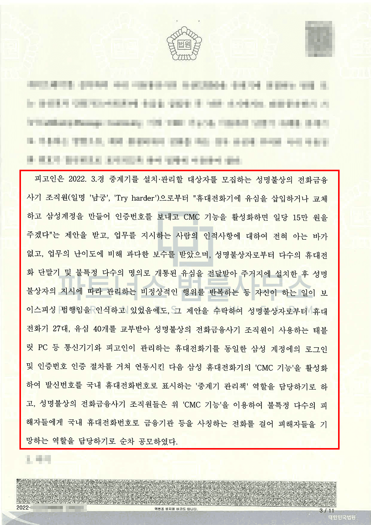 의뢰인의 경우 보이스피싱 현금수거책 및 중계기관리로서의 형사책임이 인정되어 구속이 된 상태에서 실형 선고가 불가피한 상황이었지만, 저희 파트너스법률사무소가 목숨 걸고 변론을 한 결과 집행유예를 받을 수 있었던 성공적인 사례입니다.