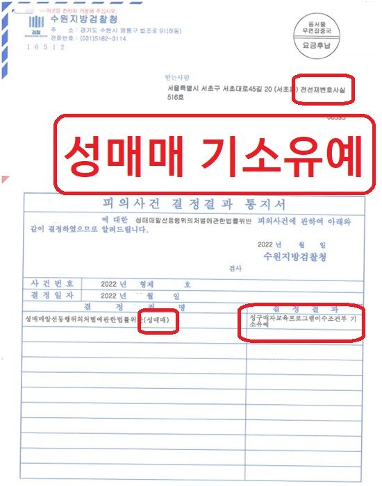 결국 검찰에서는 이러한 사항들을 고려하여 피의자가 범죄 전력이 없는 초범이라는 점, 매매 횟수가 1회에 그친 점, 스스로 뉘우치며 철저한 반성과 함께 적극적으로 재발 방지 대책을 세운 점 등을 정상에 반영하여 성구매자 교육 이수를 조건으로 성매매 혐의에 대하여 기소유예 처분을 결정했습니다. 의뢰인은 송달장소를 변호사사무실로 변경하여 송달받고 이후 일상으로 복귀할 수 있었습니다.