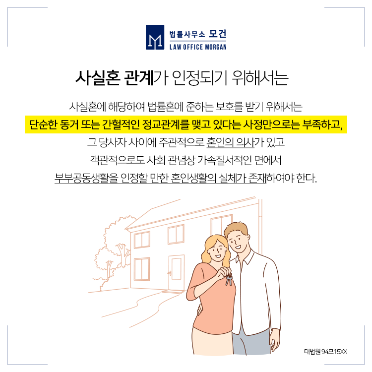 하지만 재판부는 A씨의 청구를 기각하였습니다. 단순히 동거하거나 교제하는 관계를 넘어서 두사람 사이에 혼인의사가 있었다거나 사회통념상 가족질서적인 면에서 부부공동생활을 인정할 만한 혼인생활의 실체가 존재하였다고 보기에는 부족하다고 본 것입니다.